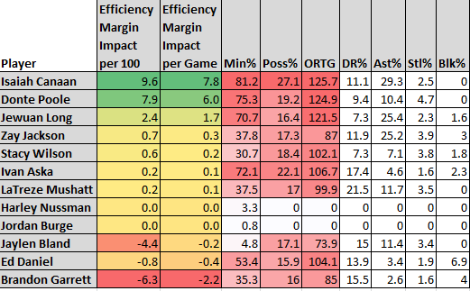 Also, I fit the "impact per game" to Murray State's expected efficiency margin against an average team (13.2, according to Kenpom.com).